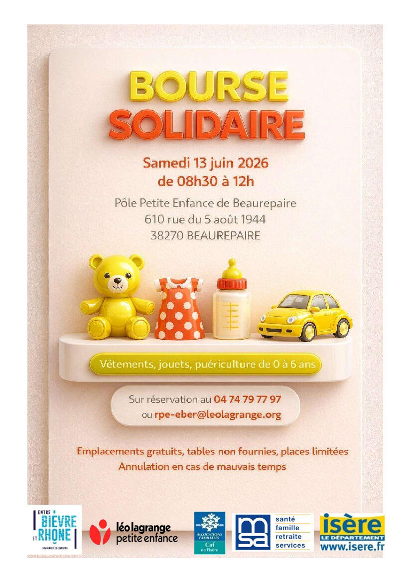 Bourse Solidaire le SAMEDI 13/06/2026 de 08h30 à 12h00 sur le parking du Pôle Petite Enfance de Beaurepaire