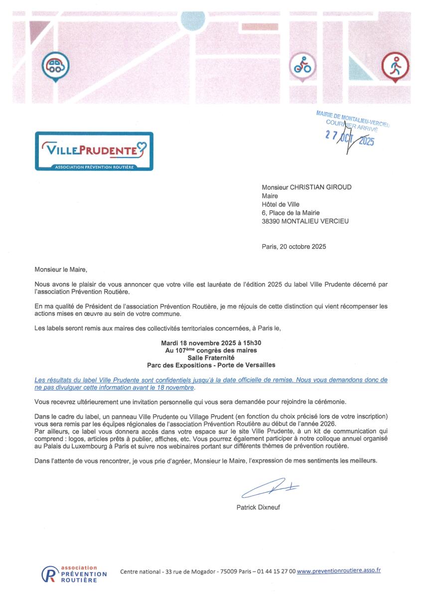 L’association prévention routière a récompensé la commune de Montalieu-Vercieu au dernier congrès des maires, qui a eu lieu en novembre, avec l’attribution du label “Ville prudente”. Ce label met en lumière les nombreuses actions de la municipalité pour améliorer la sécurité et la mobilité des habitants et des usagers.