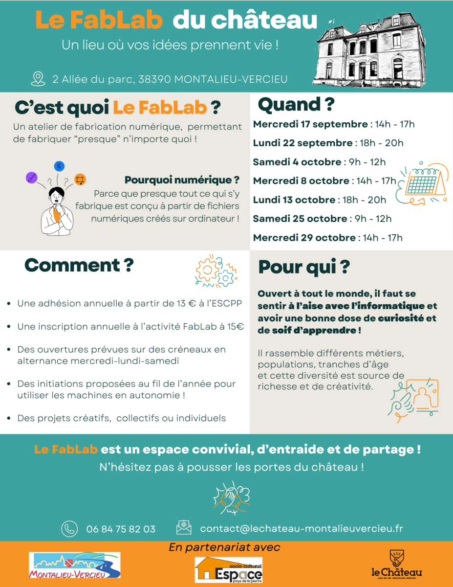 Pour l'utilisation des machines en autonomie, pensez à vous inscrire à l'activité FabLab auprès de l'ESCPP (16 B route de Vassieu 38390 à Montalieu-Vercieu), cela vous donnera accès à une session d'initiation offerte sur la machine de votre choix ! 😊