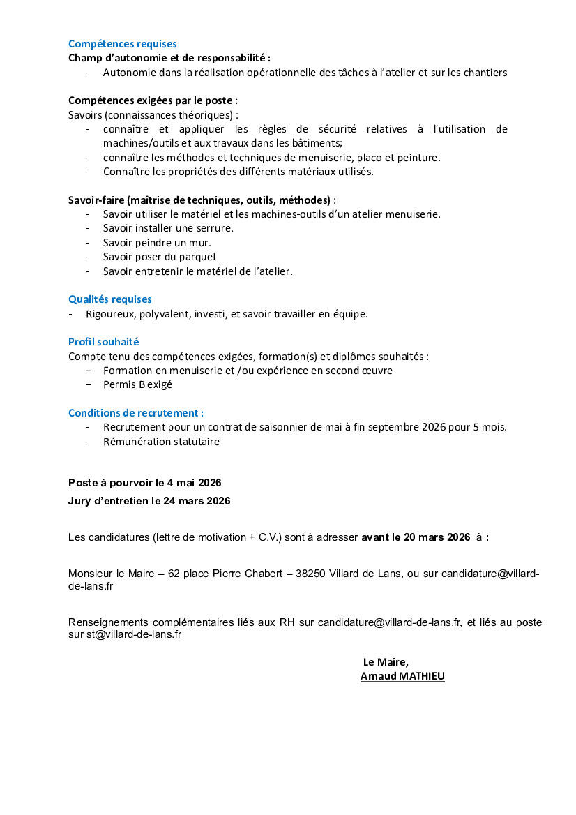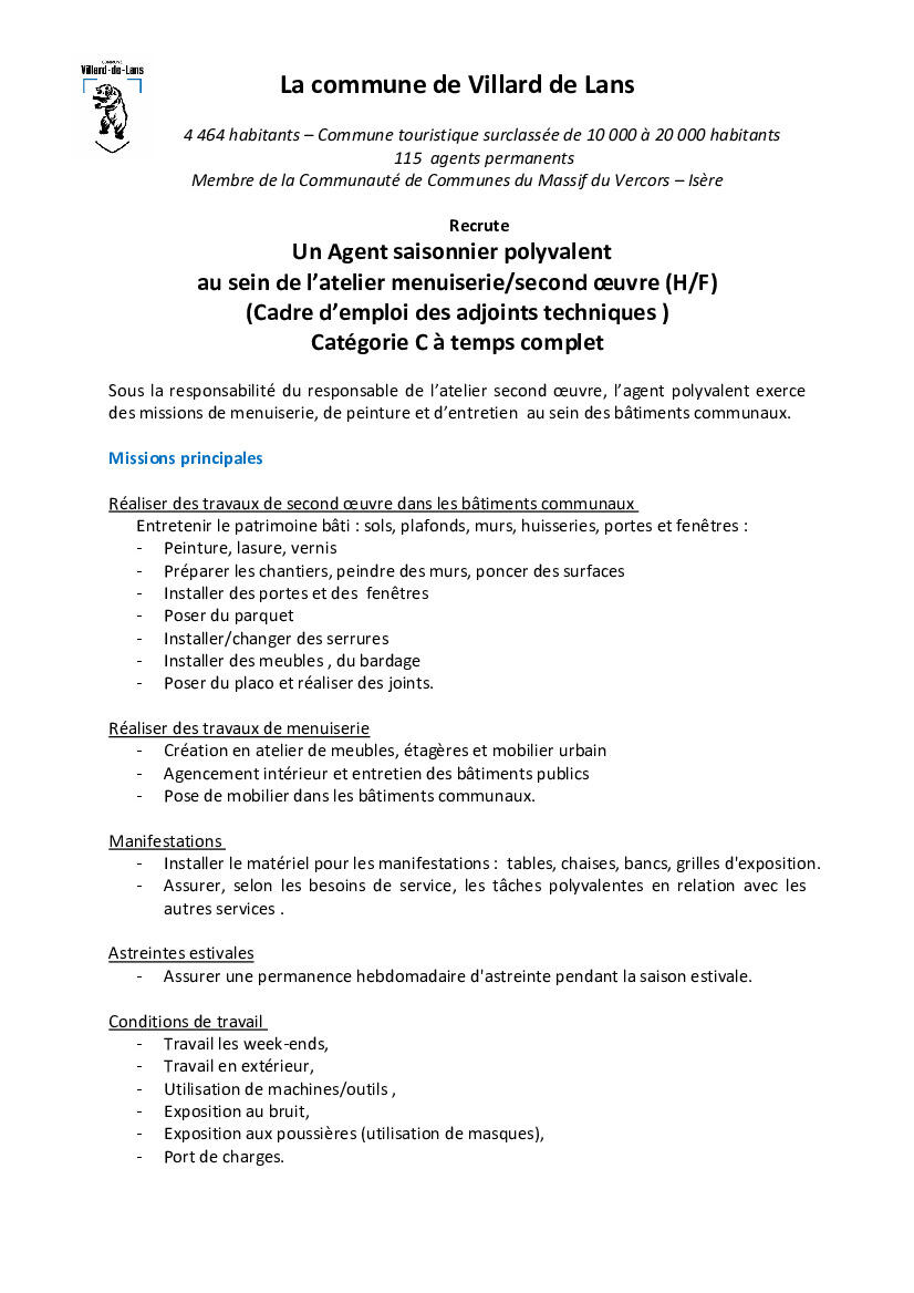 La mairie recherche un Agent saisonnier polyvalent au sein de l’atelier menuiserie/second œuvre (H/F)