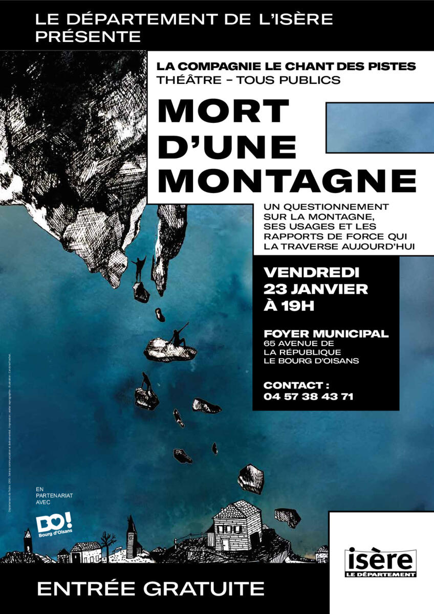 Pour information et communication, vous trouverez en pièce jointe l’affiche de la représentation d’une pièce de théâtre de la compagnie « le chant des pistes », prévue au foyer municipal de Bourg d’Oisans le vendredi 23 janvier 2026 à 19H. Intitulée « Mort d’une montagne », cette pièce a vocation à nous questionner sur la montagne, ses usages et les rapports de force qui la traverse aujourd’hui. C’est une représentation gratuite et ouverte à tous dans la limite de 300 personnes.