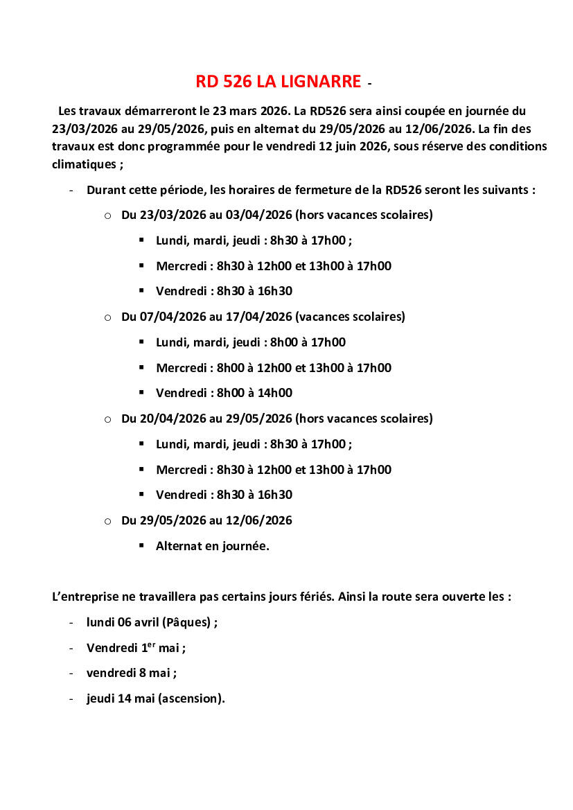 Les travaux démarreront le 23 mars 2026. La RD526 sera ainsi coupée en journée du 23/03/2026 au 29/05/2026, puis en alternat du 29/05/2026 au 12/06/2026. La fin des travaux est donc programmée pour le vendredi 12 juin 2026, sous réserve des conditions climatiques ;