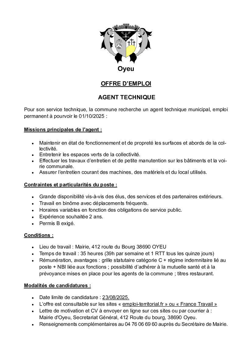 Votre mairie / Actualités / OFFRE D'EMPLOI AGENT TECHNIQUE