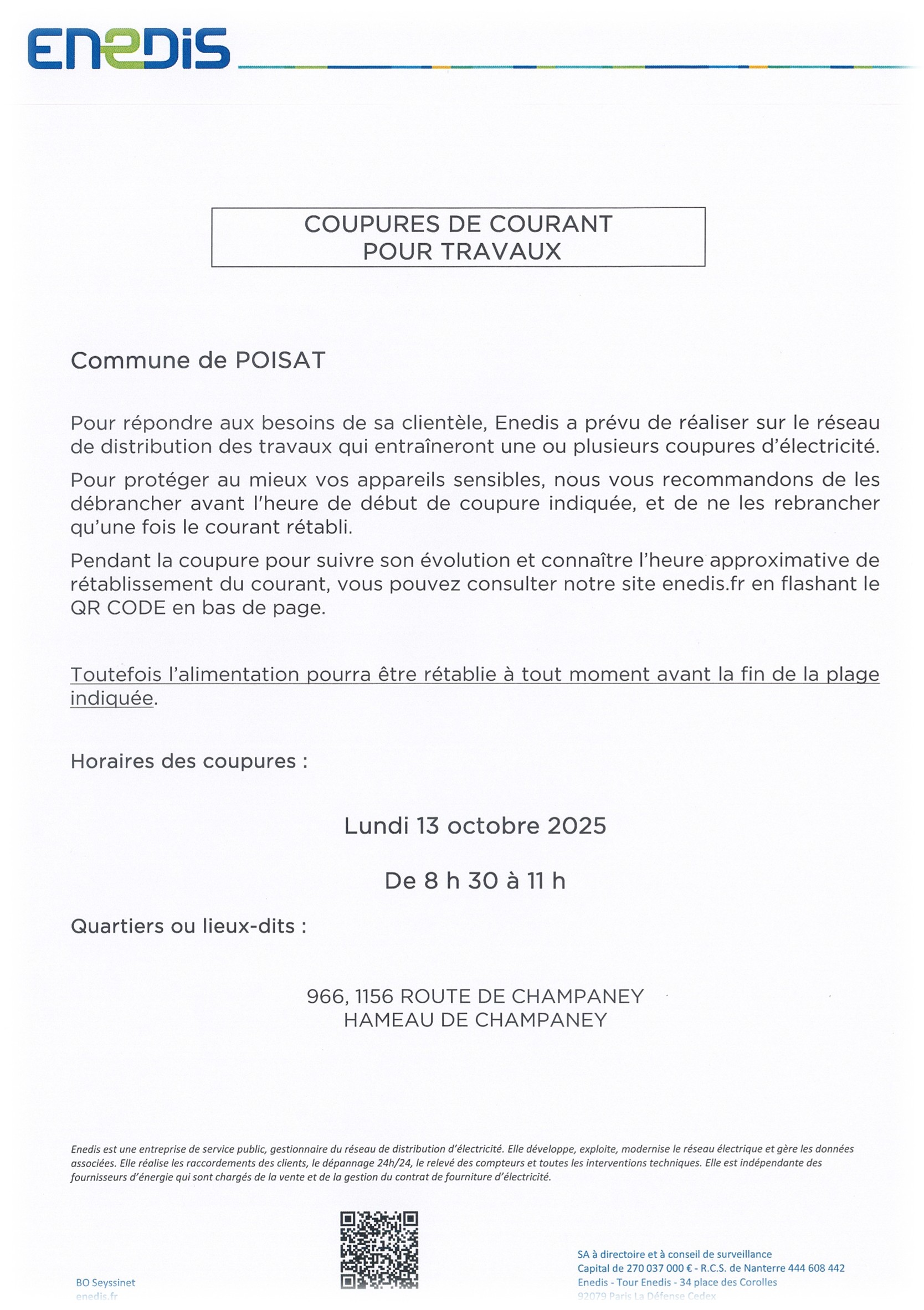/ ENEDIS·Avis de coupure de courant pour travaux·Le 13/10