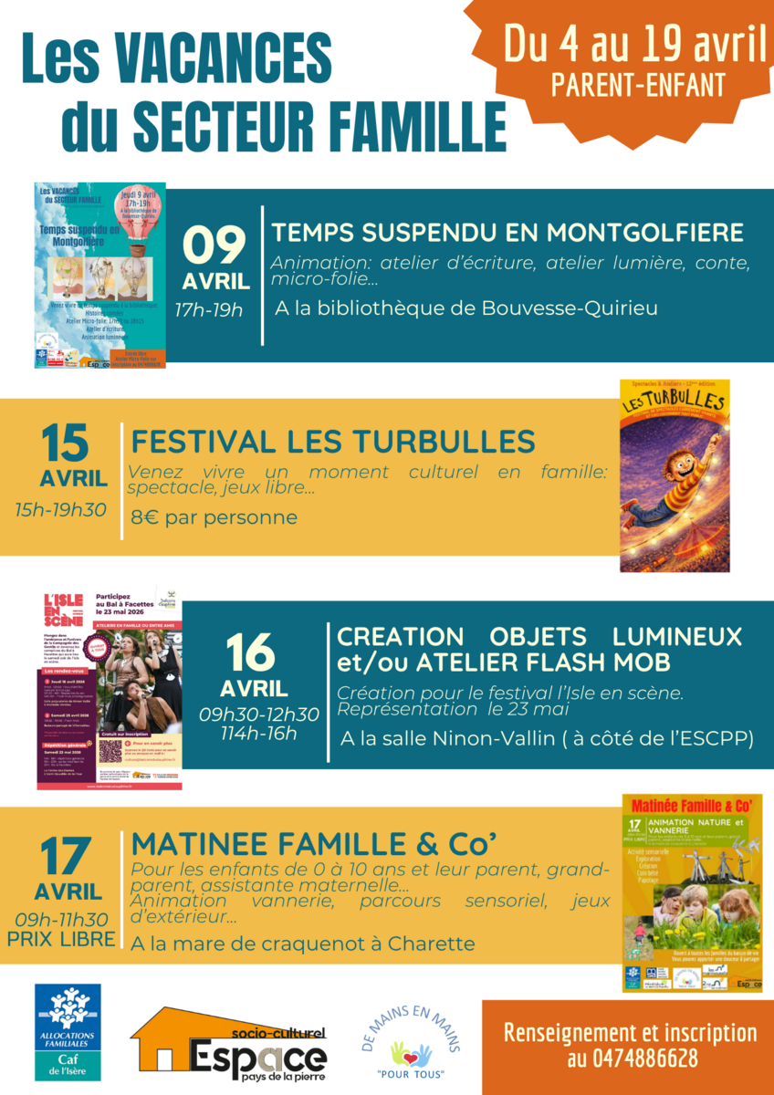 Animations du secteur famille - ESCPP 30/03/2026 Le programme du secteur famille pour les vacances d’avril. Sur inscription