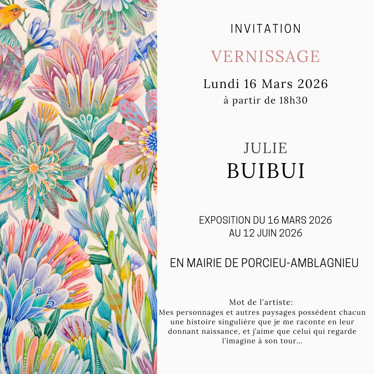 Vernissage de l’exposition de Julie BUIBUI le lundi 16 mars 2026 a 18h30 en mairie.