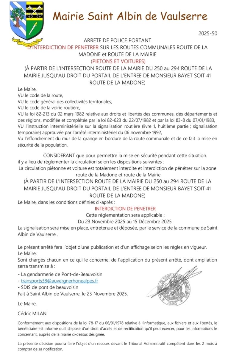 ATTENTION ROUTE DE LA MAIRIE ET ROUTE DE LA MADONE FERMÉES