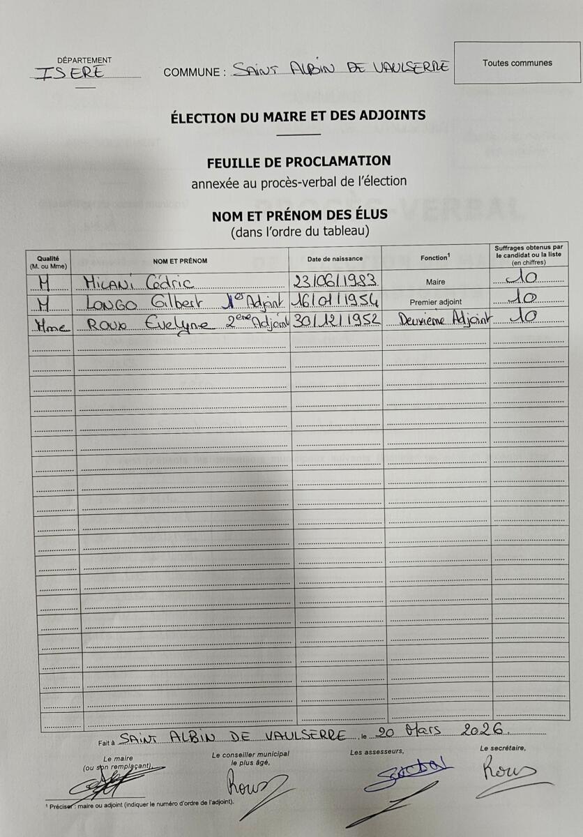 Vendredi 20 mars 2026, élections du Maire et des Adjoints.