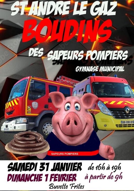 Boudins Des Pompiers 24/01/2026 Les sapeurs-pompiers de la caserne de Saint-André-le-Gaz - Le Passage organisent leur traditionnelle vente de boudins samedi 31 janvier de 16h à 19h et dimanche 1er février à partir de 9h, au gymnase de Saint-André-le-Gaz.
