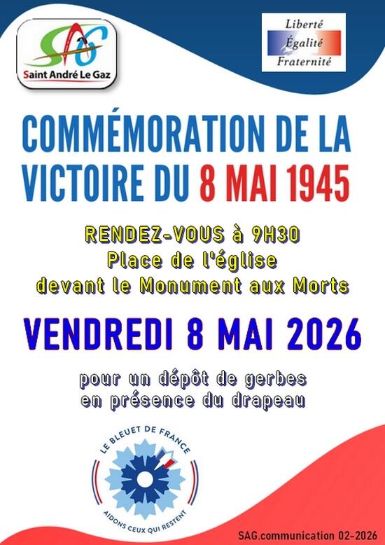La Municipalité vous invite à participer au défilé qui partira à 9h15 de la place Cuzin, puis à la cérémonie commémorative qui aura lieu le vendredi 8 mai 2026, à 9H30