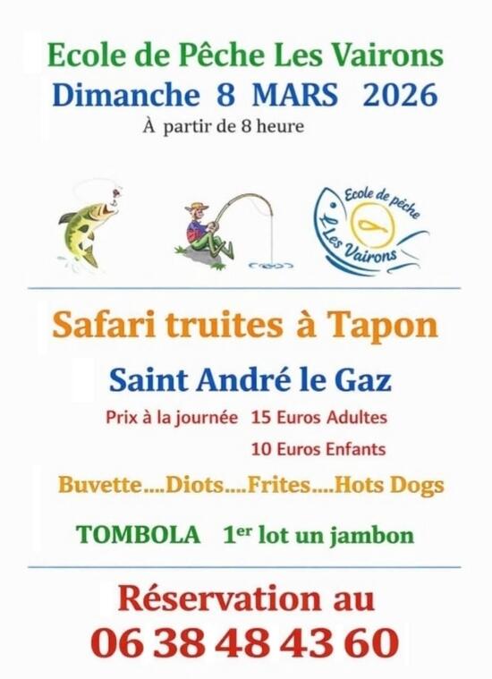 Safari Truites De L'ecole De Pêche Les Vairons 24/02/2026 Dimanche 8 Mars 2026, venez taquiner la truite à l'étang de Tapon... Safari organisé par l'Ecole de Pêche Les Vairons de Saint-André-le-Gaz... ... les membres et les enfants vous attendent nombreux ....