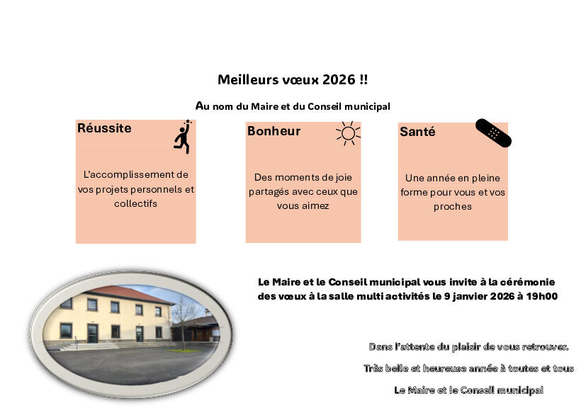 Le Maire et son Conseil Municipal, vous invitent à la cérémonie des voeux, le vendredi 09 janvier 2026, à 19 heures, à la salle multi activités.