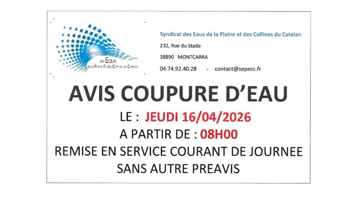 Avis de coupure d'eau le jeudi 16 avril à partir de 8h.