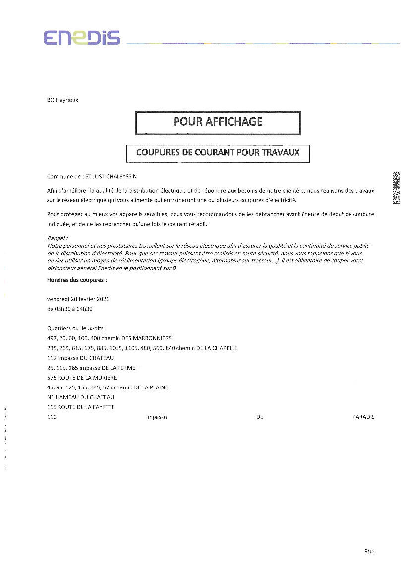 Coupure d'électricité : Vendredi 20 février 2026