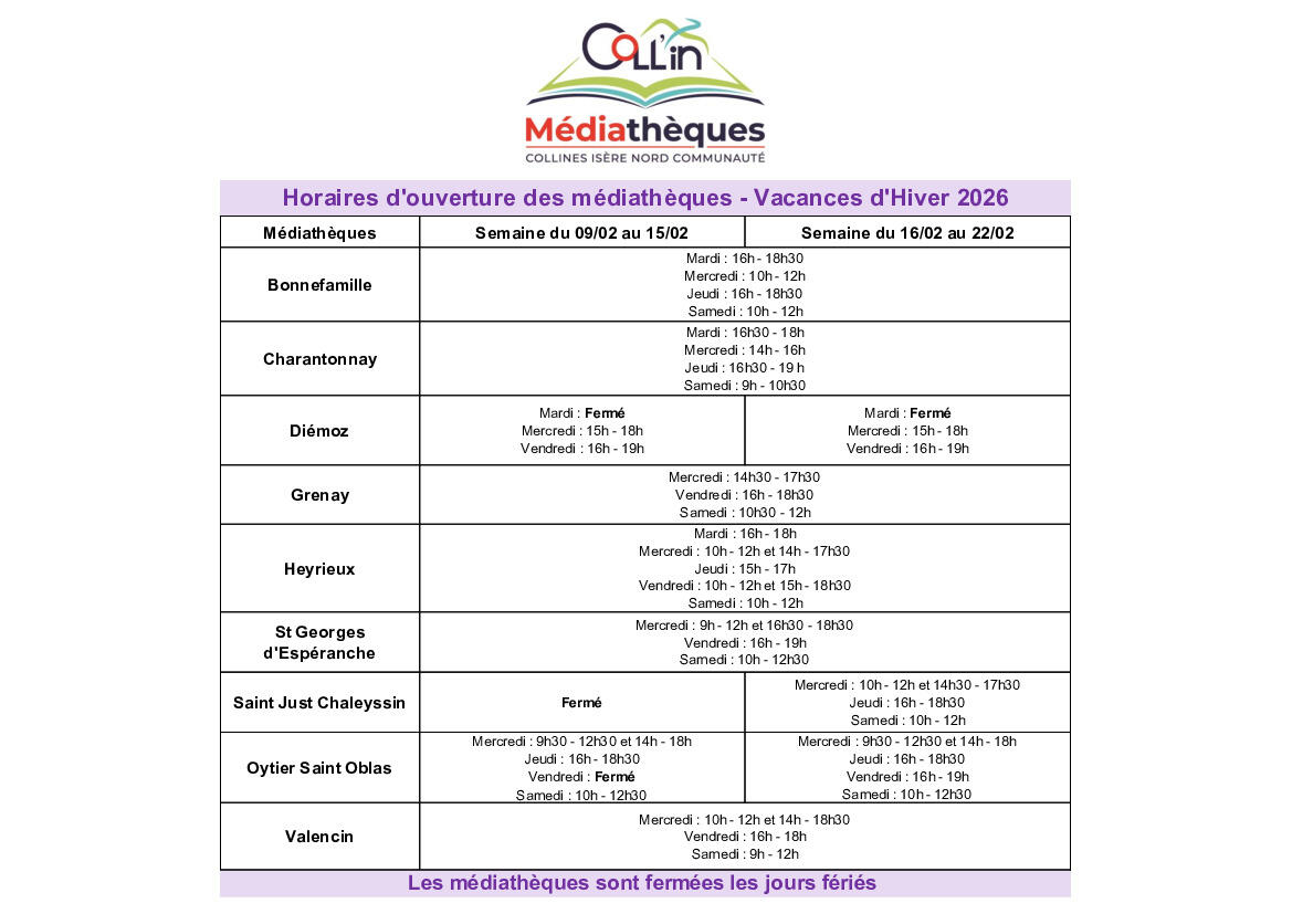 Calendrier d'ouverture des médiathèques - vacances d'hiver 30/01/2026 Plus d'infos ci-dessous : Source : Mairie de Saint-Just-Chaleyssin