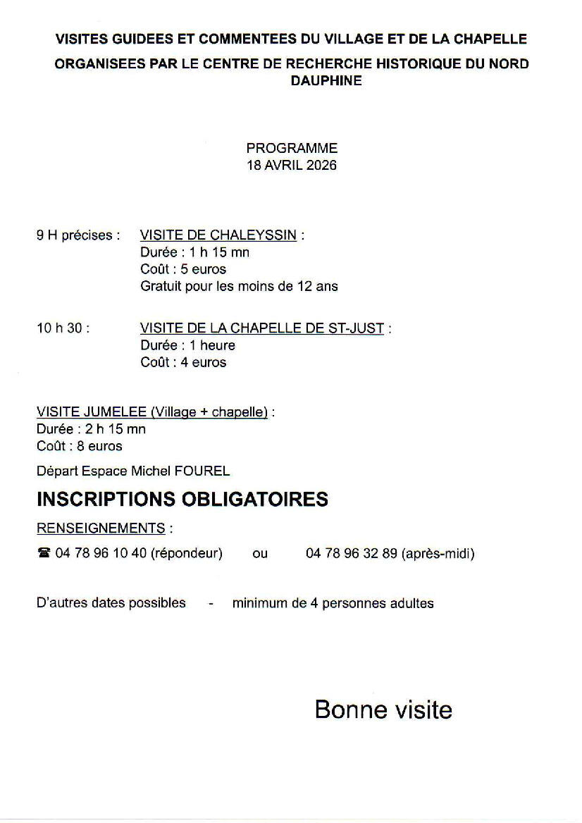 Le Centre de Recherche Historique du Nord Dauphiné organise des visites guidées et commentées du village et de la chapelle ,le 18 avril , plus d'information ci-dessous: