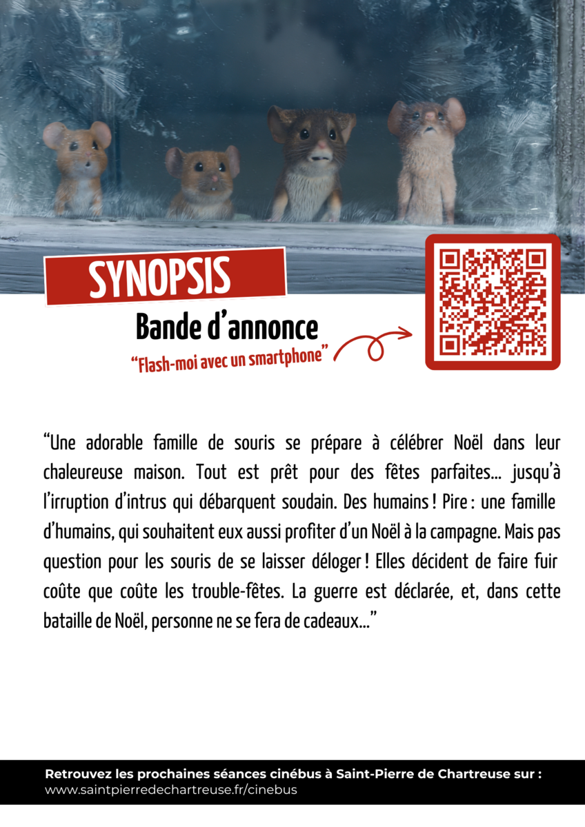 Synopsis : “Une adorable famille de souris se prépare à célébrer Noël dans leur chaleureuse maison. Tout est prêt pour des fêtes parfaites… jusqu’à l’irruption d’intrus qui débarquent soudain. Des humains ! Pire : une famille d’humains, qui souhaitent eux aussi profiter d’un Noël à la campagne. Mais pas question pour les souris de se laisser déloger ! Elles décident de faire fuir coûte que coûte les trouble-fêtes. La guerre est déclarée, et, dans cette bataille de Noël, personne ne se fera de cadeaux…”