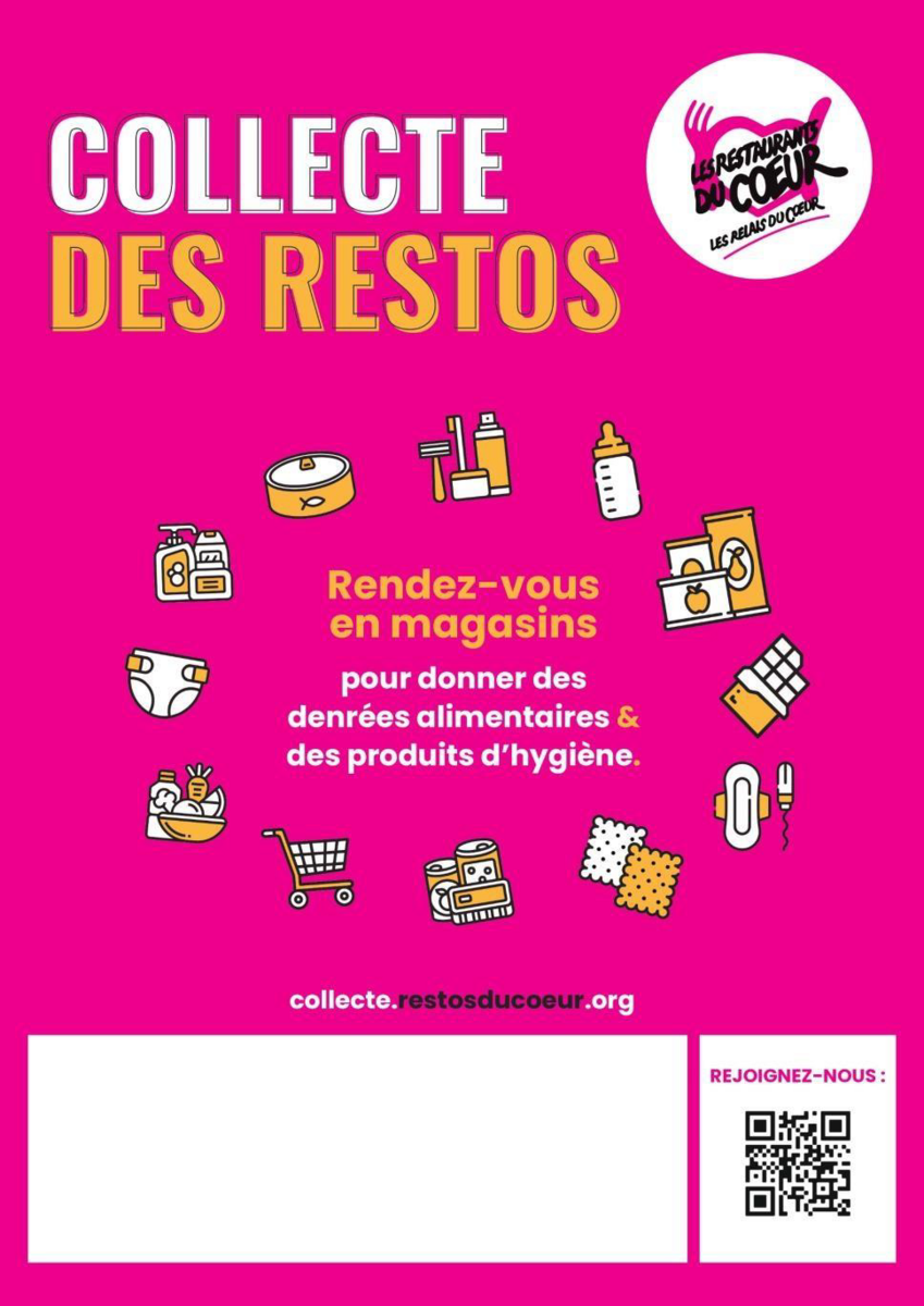 ➡ Vous trouverez, à l'entrée du magasin, un dépliant qui indique les principaux produits dont les bénéficiaires des Restos du cœur ont besoin: