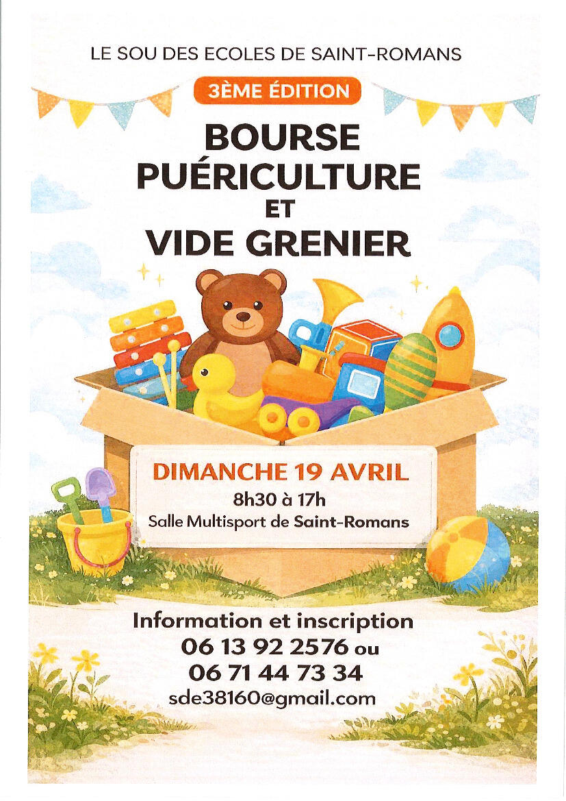 Bourse Puériculture Et Vide Grenier 24/03/2026 Le dimanche 19 avril de 8H30 à 17H Rue du 19 mars 1962 Buvette, petit déjeuner et snacking sur place Comptant sur votre présence
