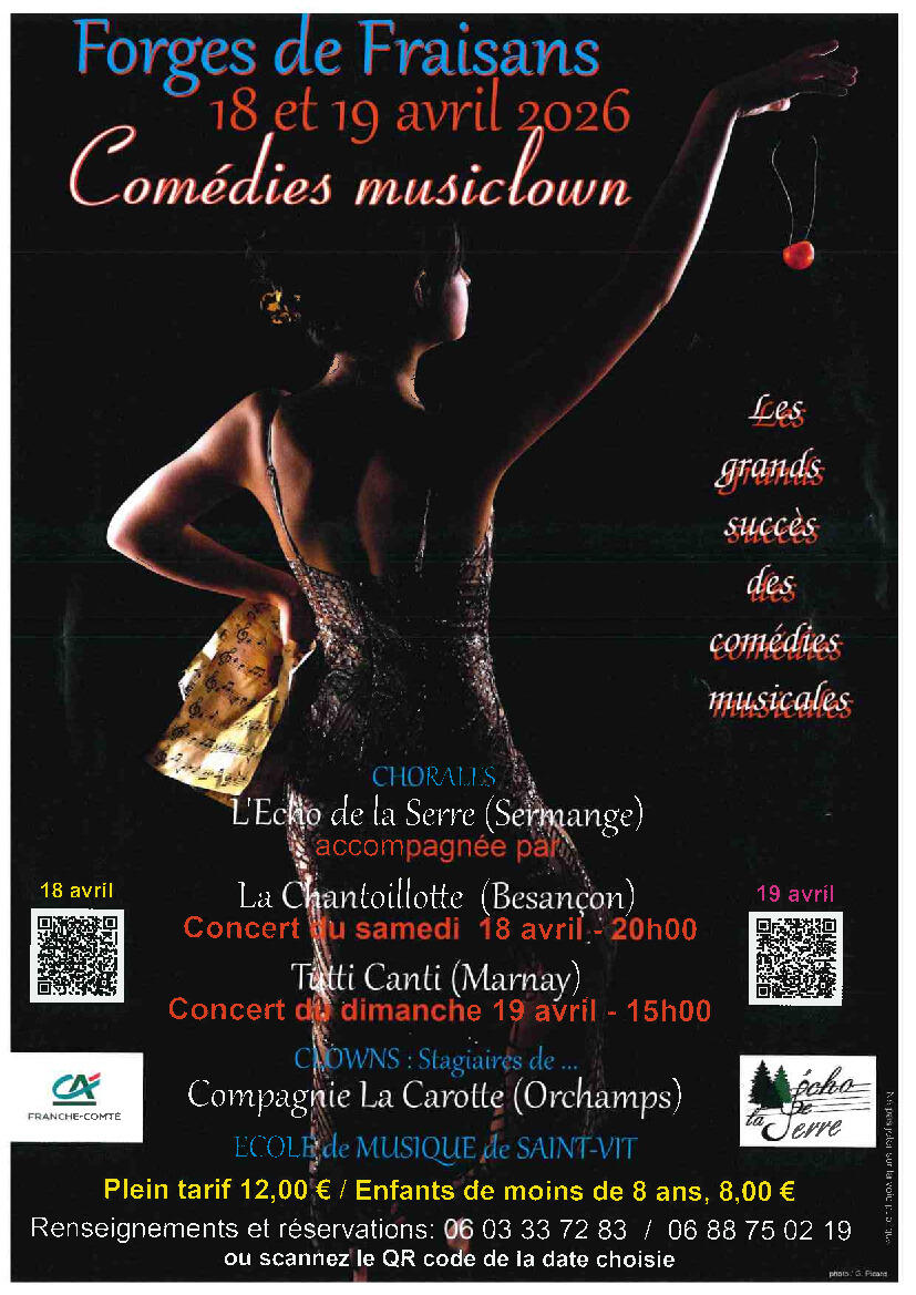 Le 18 et 19 Avril spectacles musicaux aux Forges de Fraisans , notament la chorale de la Serrre qui offrira un magnifique concert issue de chanteurs de nos villages avoisinants .