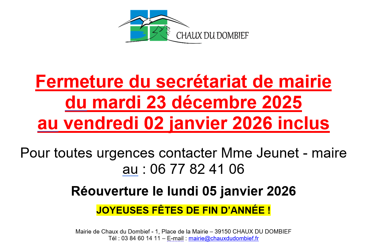 fermeture du secrétariat de mairie du 23-31 décembre inclus