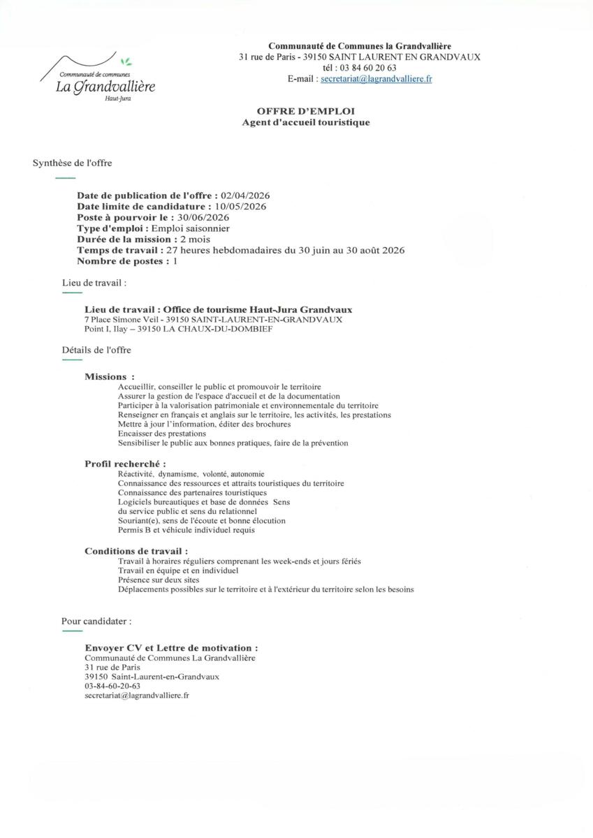 Offre d’emploi Agent d’accueil touristique