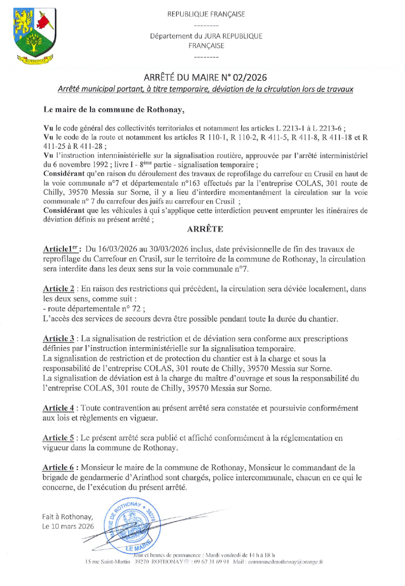 La voie communale n°7 de ROTHONAY à BEFFIA sera interdite à la circulation dans les deux sens du lundi 16/03/2026 au lundi 30/03/26 inclus, date prévisionnelle de fin de travaux de reprofilage du Carrefour "en Crusil"