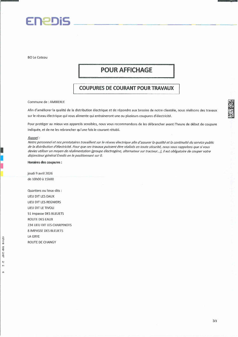 Coupures de courant pour travaux 14/04/2026 Jeudi 9 avril 2026 de 10h00 à 15h00 Source : Mairie d'Ambierle