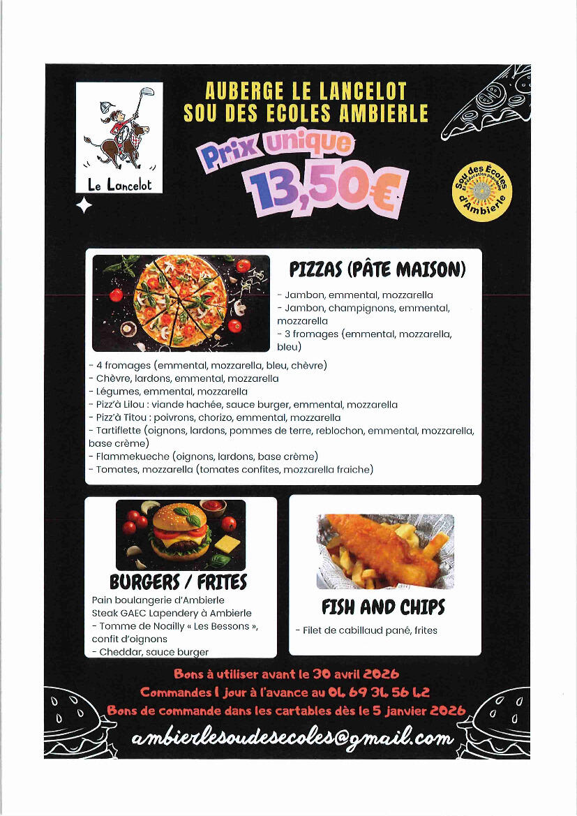 Vente De Bons -Sou Des Écoles ! 09/01/2026 Régalez-vous pour le sou des écoles! Réservez avant le 15 janvier 2026 des "bons Lancelot" et utilisez les jusqu'en Avril pour commander vos pizzas, burgers ou fish and chips au Lancelot!