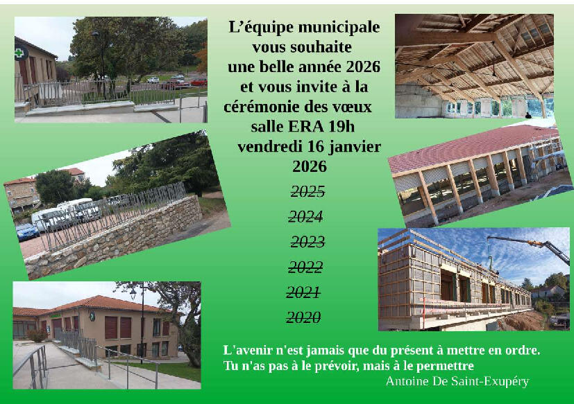 Voeux 2026 ! 09/01/2026 L'ensemble de la population est cordialement invitée à la cérémonie des vœux qui se déroulera le vendredi 16 janvier 2026 à la salle ERA à partir de 19h. BONNE ET HEUREUSE ANNEE 2026 A TOUS🤩 !