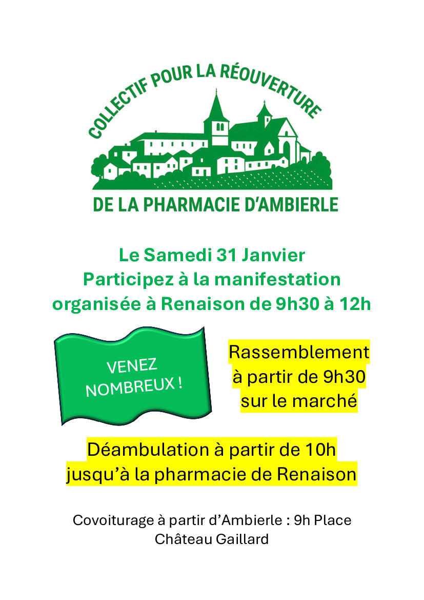 Le collectif pour la réouverture de la pharmacie de notre village vous rappelle la Manifestation de ce samedi 31 janvier à partir de 9 h 30 heures (départ du marché de Renaison).