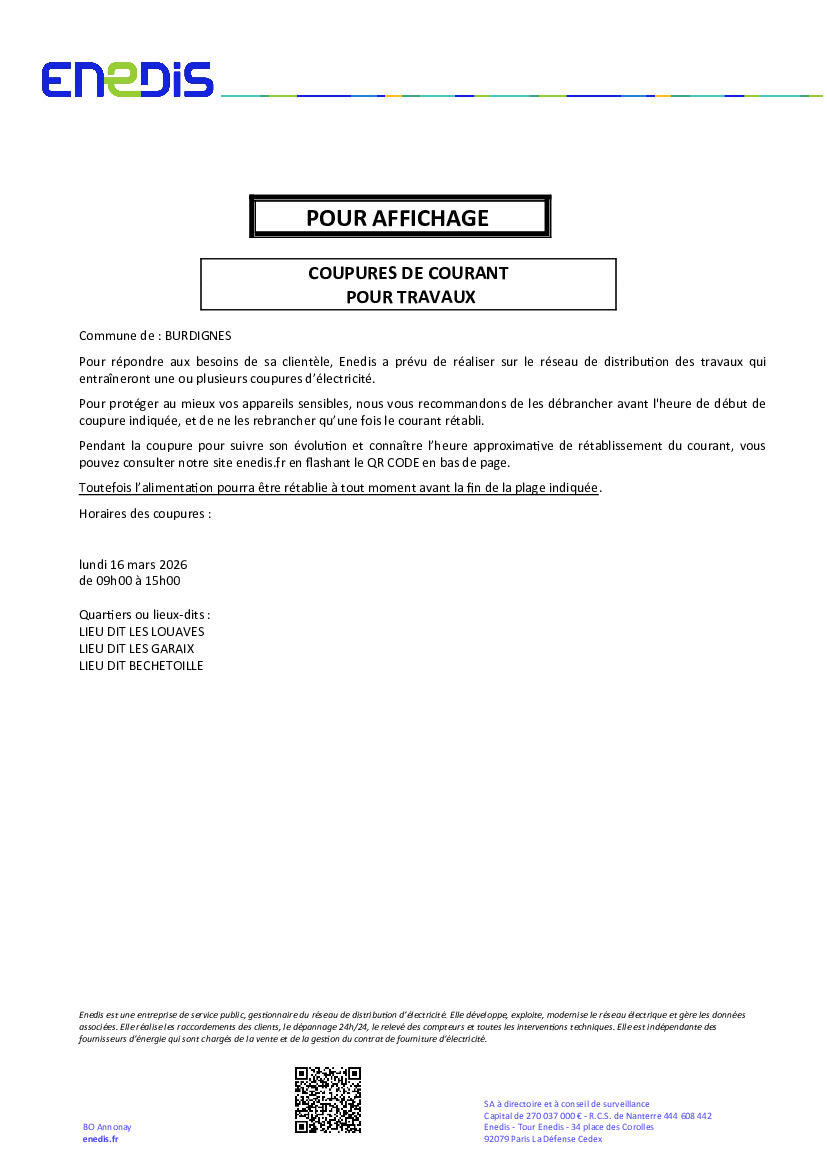 Coupure Électricité 16 Mars 2026 06/03/2026 ENEDIS Informe qu'une coupure d'électricité est programmée le 16 mars 2026 secteur Les louaves - les garaix - bechetoille
