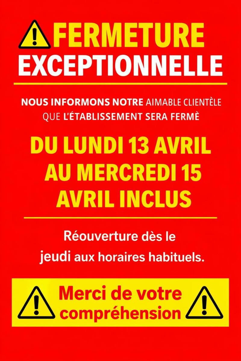 Aux Mille et Une Saveurs : fermeture exceptionnelle du 13 au 15 avril 2026 inclus.
