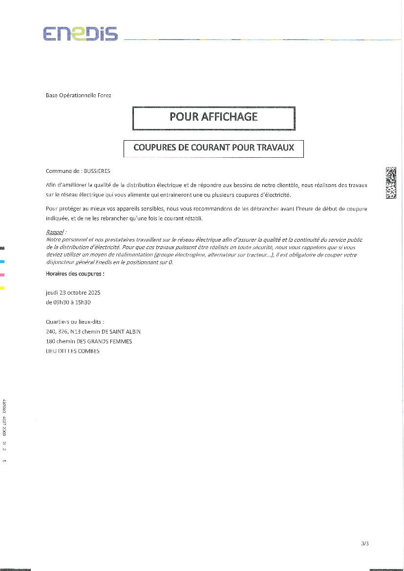 Enedis nous informe qu'une coupure de courant aura lieu pour travaux sur le réseau électrique le jeudi 23 octobre de 09h30 à 15h30 dans les quartiers suivants :