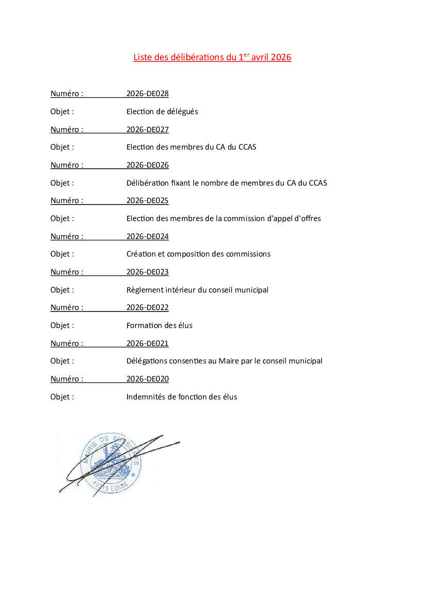 Liste des délibérations prise par le conseil municipal le 1er avril 2026.