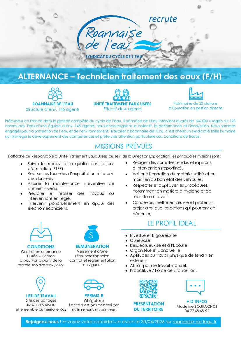 Votre mairie / Actualités / ROANNAISE DE L’EAU RECRUTE UN(E) ALTERNANT(E) TECHNICIEN(NE)