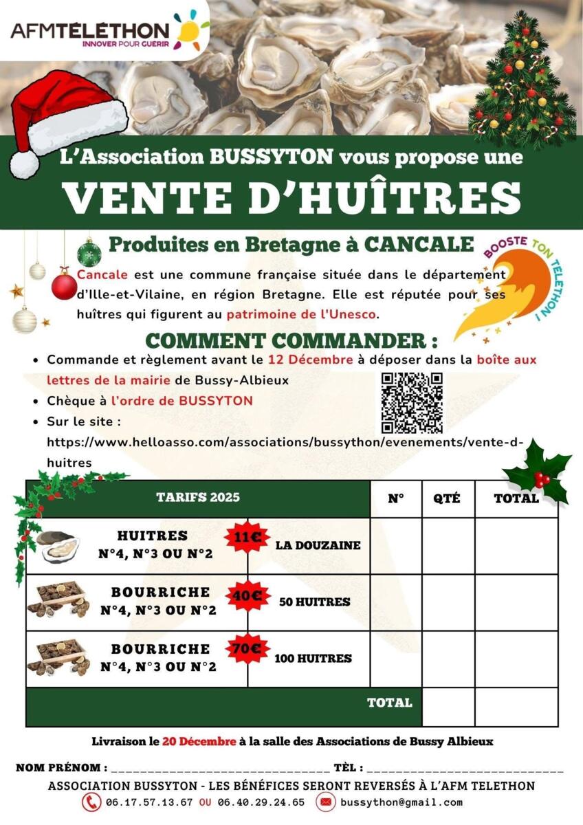 L’équipe du Bussyton remercie tous les participants et bénévoles pour ce beau week-end. Afin de terminer l’année en beauté, l’association vous propose une vente d’huîtres pour les fêtes de fin d’année. Les bénéfices seront reversés à l’AFM Téléthon