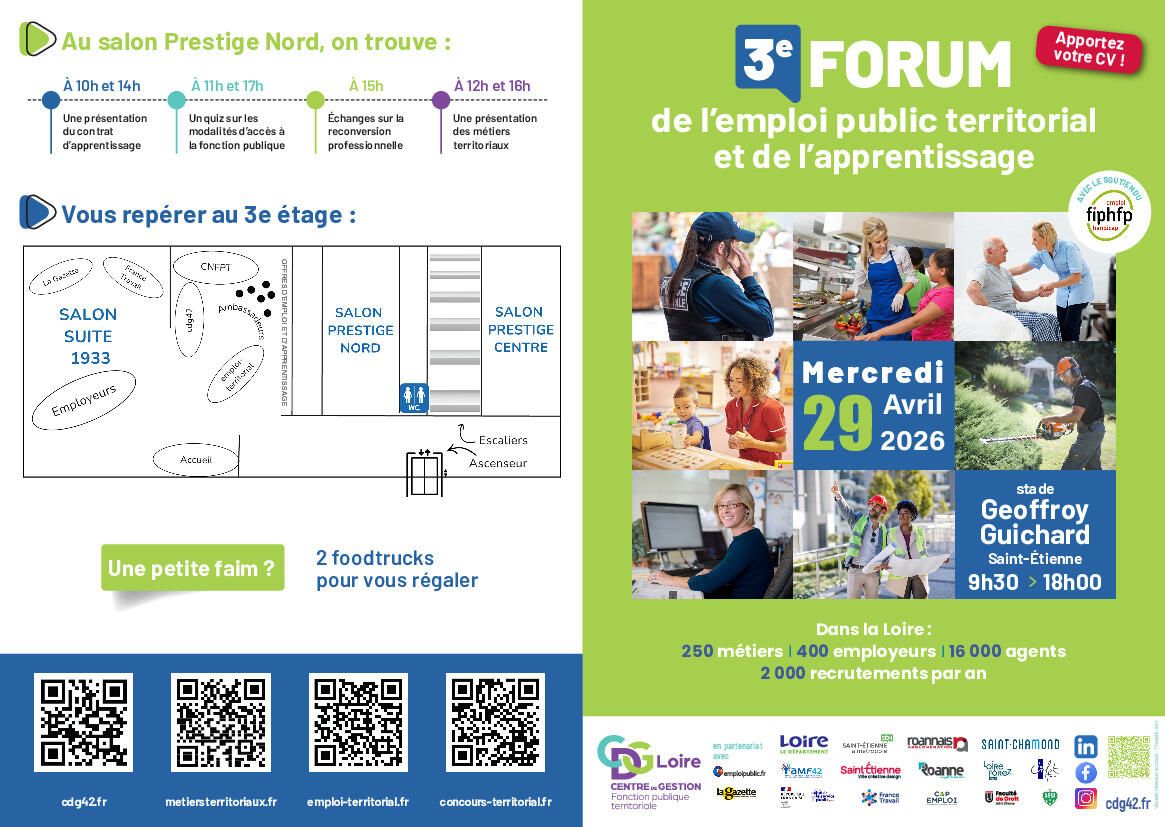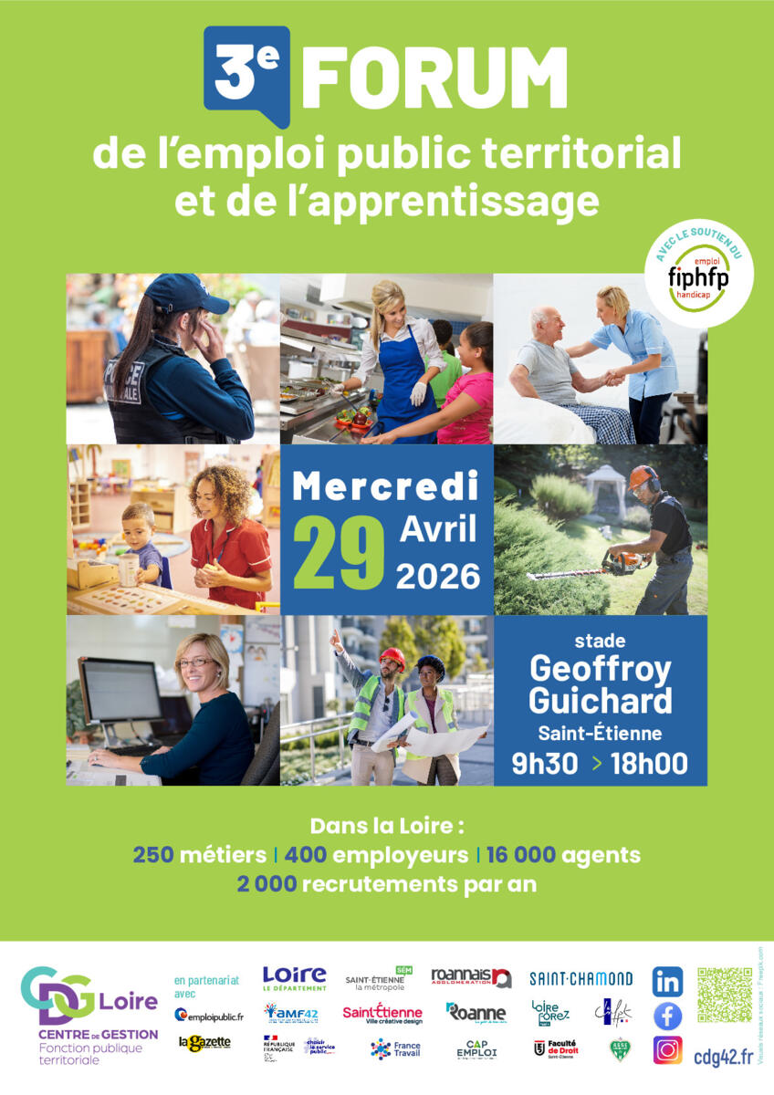 Ce forum aura lieu le mercredi 29 avril 2026 de 9h30 à 18h00 au stade Geoffroy Guichard, pour découvrir les offres d’emploi de la fonction publique territoriale dans le département de la Loire.