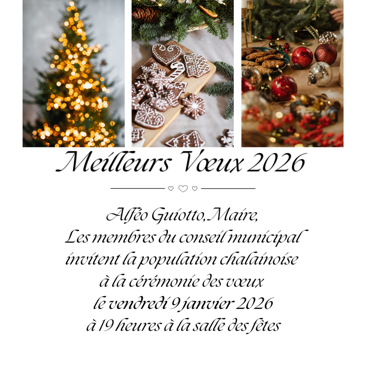 Le Maire et son conseil municipal vous invitent à la cérémonie des vœux le vendredi 9 janvier 2026 à 19h à la salle des fêtes
