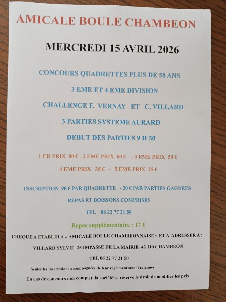 INFO MAIRIE 14/03/2026 Amis boulistes l'Amicale des boules vous donne rendez vous le mercredi 15 avril 2026 Source : Mairie de Chambéon