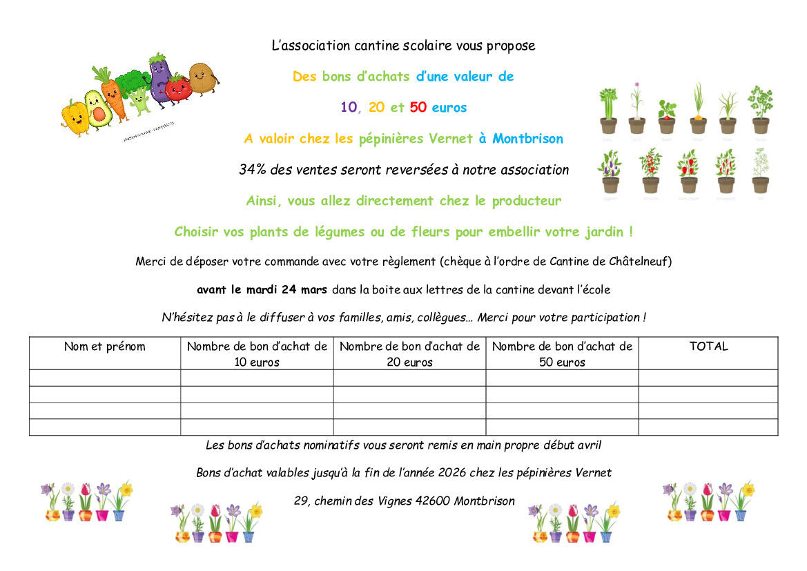 L’association cantine scolaire vous propose Des bons d’achats d’une valeur de 10, 20 et 50 euros A valoir chez les pépinières Vernet à Montbrison