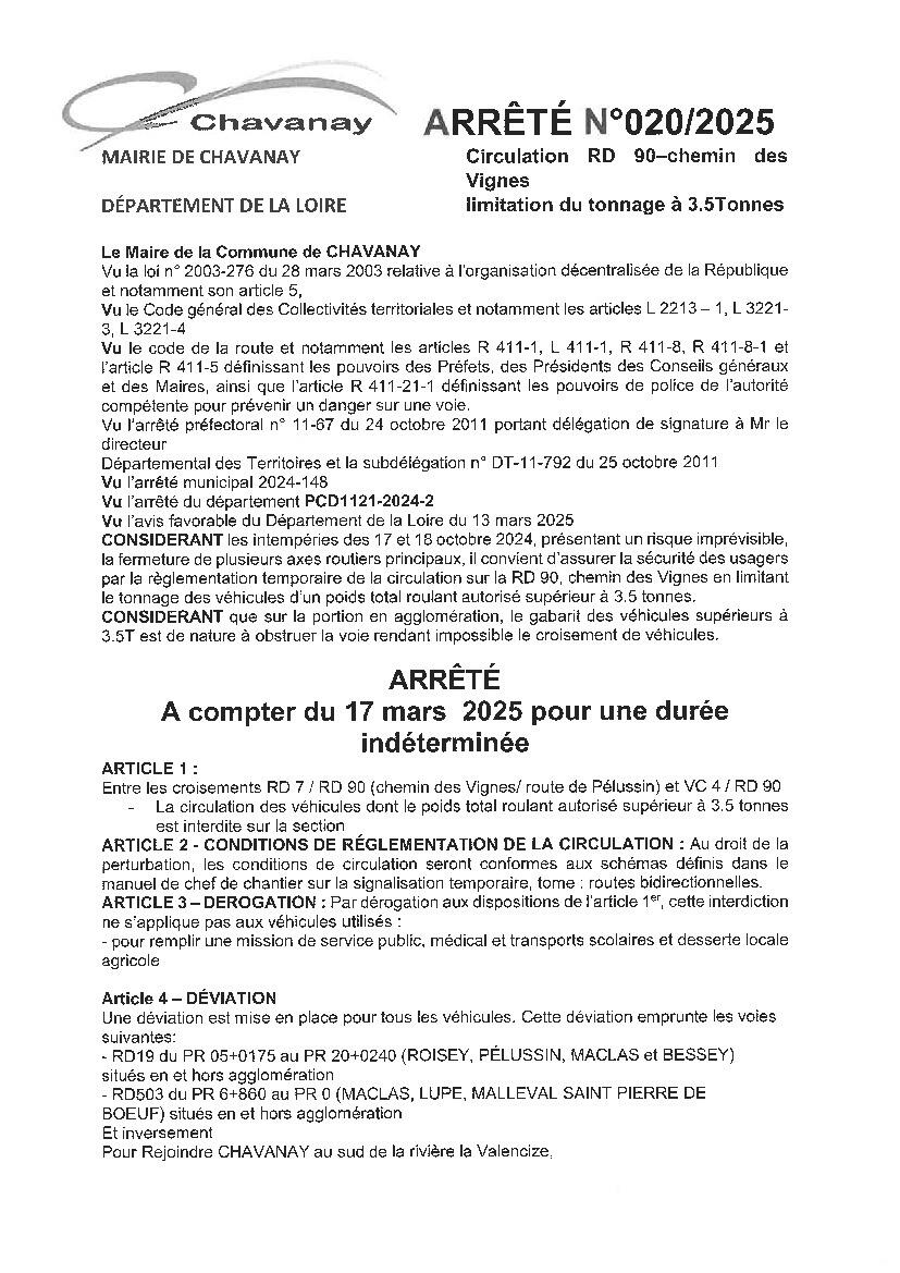 Suite à l’arrêté municipal en date du 17 mars 2025, règlementant la circulation aux véhicules de plus de 3,5 tonnes sur la RD 90 (Chemin des Vignes).