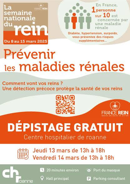 DEPISTAGE MALADIES RENALES 01/03/2025 Pour plus d’informations rendez-vous sur notre site : Dépistage des maladies rénales