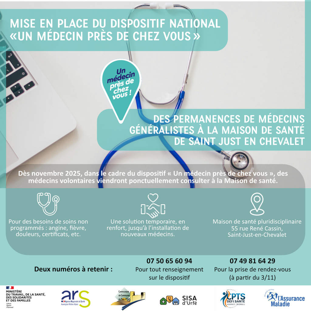 Dès le mois de novembre, des médecins volontaires assureront des consultations ponctuelles à la Maison de Santé Pluridisciplinaire, 55 rue René Cassin à Saint-Just-en-Chevalet, grâce au dispositif national de solidarité territoriale « Un médecin près de chez vous ».