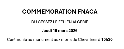 Commémoration FNACA 13/03/2026 La commémoration du Cessez le feu en Algérie aura lieu : le jeudi 19 mars 2026 à 10h30 au monument aux morts à Chevrières. Cérémonie ouverte à tous. Source : Mairie de Chevrières