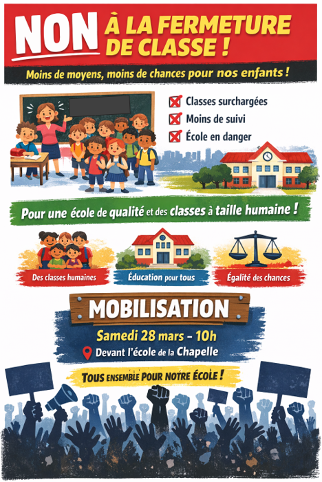 Les délégués de parents se mobilisent. Rejoignez les ce samedi 28 mars à 10h00 devant l'école de La Chapelle-Villars !