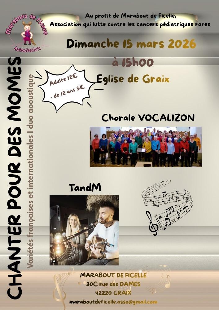 Erratum - Chanter Pour Des Momes 26/02/2026 dimanche 15 mars 2026 à 15h00 à l'église de Graix après-midi musique et chansons au profit de l'association Marabout de ficelle qui lutte contre les cancers pédiatriques rares.