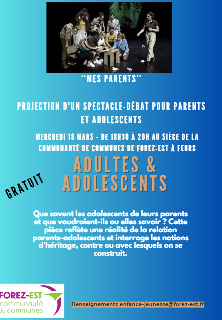 Dans le cadre des Semaines de la Petite Enfance et des familles, la Communauté de Communes de Forez-Est propose une projection d’un spectacle suivi d’un débat le mercredi 18 mars à 18H30 au siège de la Communauté de Communes de Forez-Est.