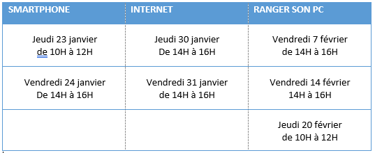En partenariat avec Loire Forez Agglomération, le CCAS d'Ecotay l'Olme organise des ateliers numériques. En comité restreint, ces animations vous permettront de vous familiariser sur trois thématiques spécifiques. Ci dessous, le planning des ateliers encore disponibles :
