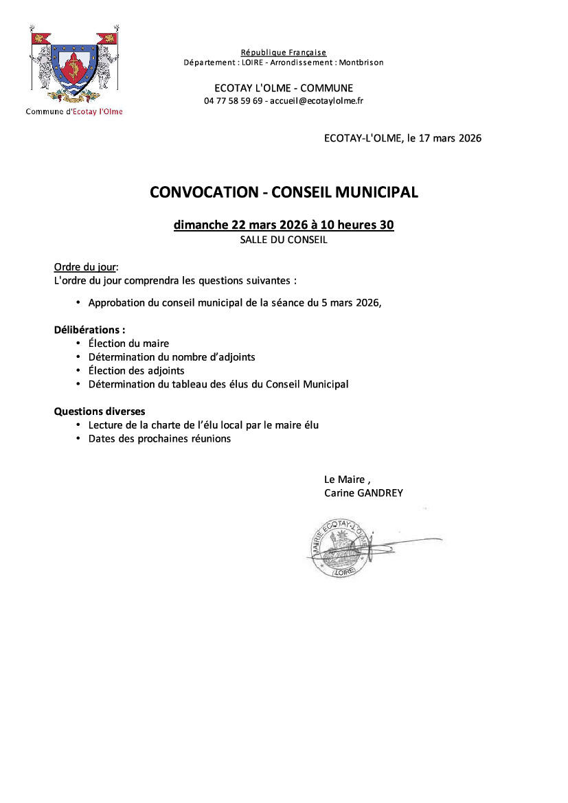 Le prochain Conseil municipal d’Écotay‑l’Olme se tiendra le dimanche 22 mars 2026 à 10h30, en salle du Conseil.